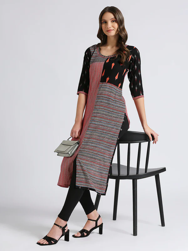 “Unleash your inner fashionista with our black and red straight kurti. Perfect for any occasion, this stylish piece will make you stand out from the crowd. Pair it with your favorite accessories for a complete and trendy look!”